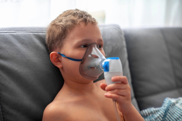 child using nebulizer due to respiratory issues caused by sewer gas exposure