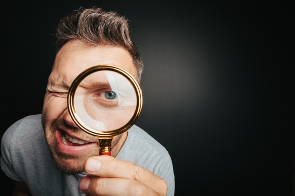 man holding a magnifying glass in front of his left eye depicting Signs Your Sump Pump May Be Failing